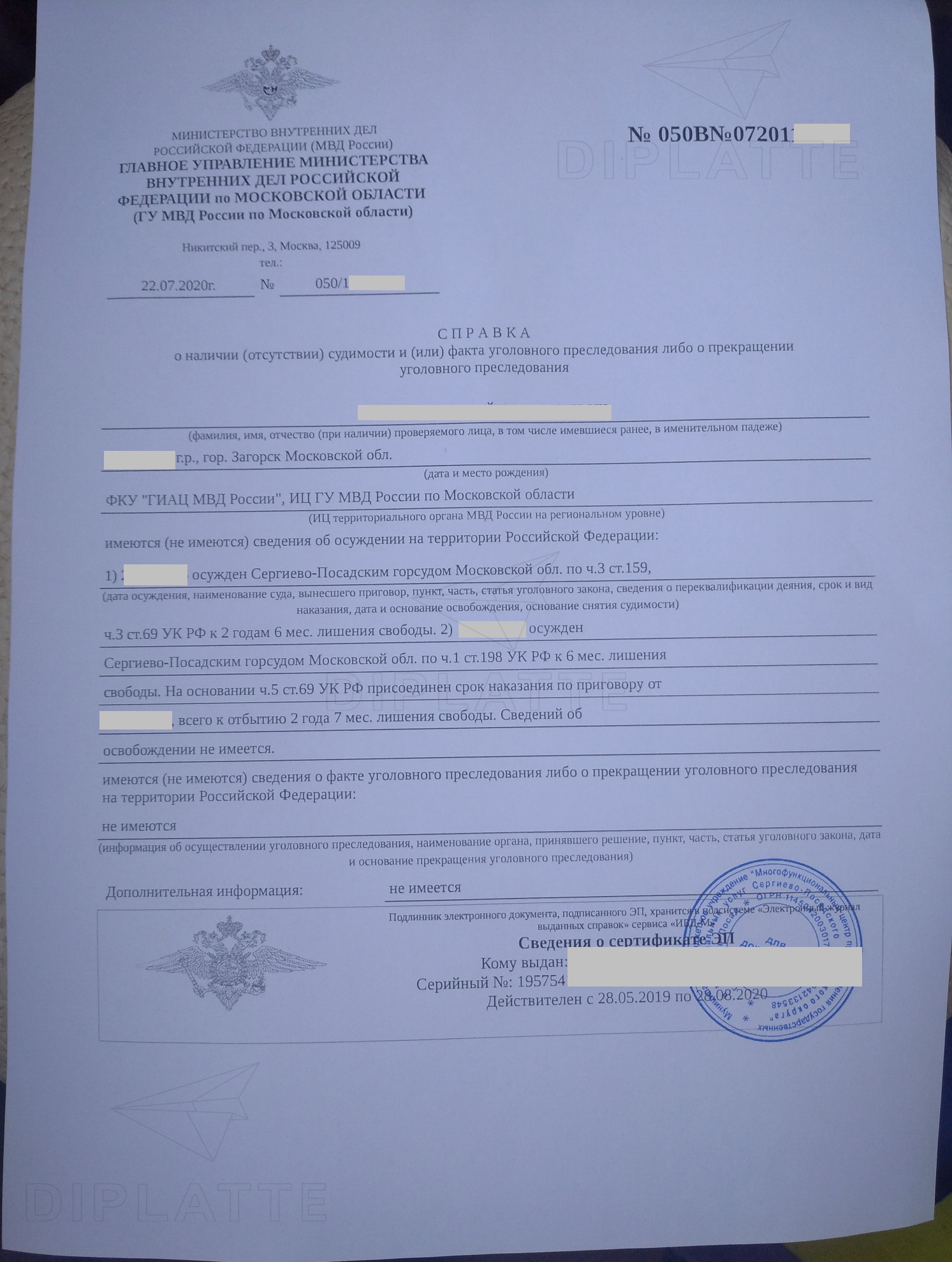 Справку о несудимости через официальные органы вы будете делать от 14 дней. Покупка через Диплатте займёт намного меньше времени. Если вам нужен только электронный вариант — в формате pdf (как выдаётся на Госуслугах), то 1 рабочий день. Но если вам нужен бумажный вариант, то нужно прибавить время доставки.